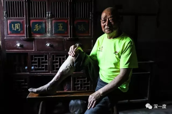 2017年7月,丽水莲都区联城街道,80岁的夏德连。夏德连12岁时得了“烂脚病”。因为没钱治疗,只能自己买药,始终无法治愈。要不是有人前来调查细菌战,他还不知道自己的腿疾与细菌战相关。经过在上海治疗,目前在夏德连的腿只是偶尔发痒,可以用药控制。
