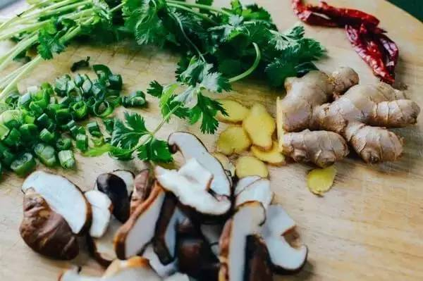 1、洗净食材,鲜菇切片,姜蒜切片,葱花香菜切段。