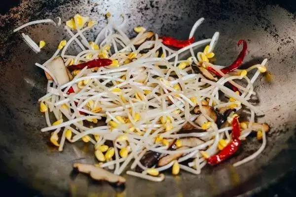 2、姜蒜爆锅,下香菇翻炒,然后加入干辣椒、豆芽一起翻炒。