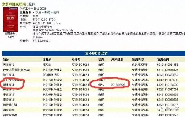 文章还例举了一本《米其林红色指南:纽约》,在孔夫子旧书网卖120元,馆藏条码为61221110124200,也与杨浦区图书馆该书信息吻合。