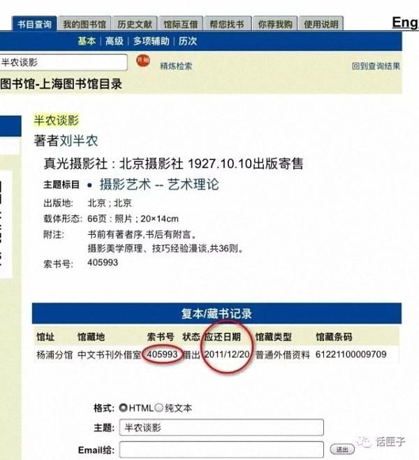 上海图书馆官网显示,《半农谈影》已逾期不还6年有余。图片来自微信公号“话匣子”