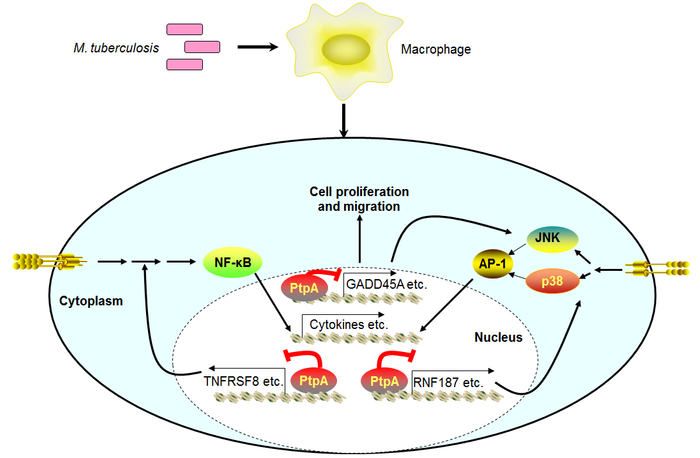 图2. 宿主细胞核内的Mtb PtpA抑制固有免疫功能并促进肿瘤细胞增殖的机制示意图