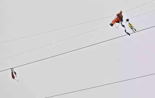 ↑电力部门工作人员正在清理高压线上的风筝残骸。图/视觉中国 电线掉落 务必远离8米以外 立即拨打95598