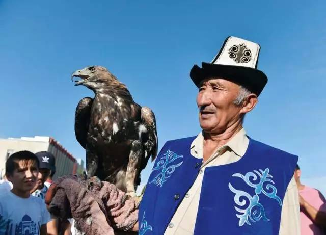 2016 年 8 月 19 日,在吉尔吉斯斯坦第二大城市奥什,一名猎手展示他的猎鹰