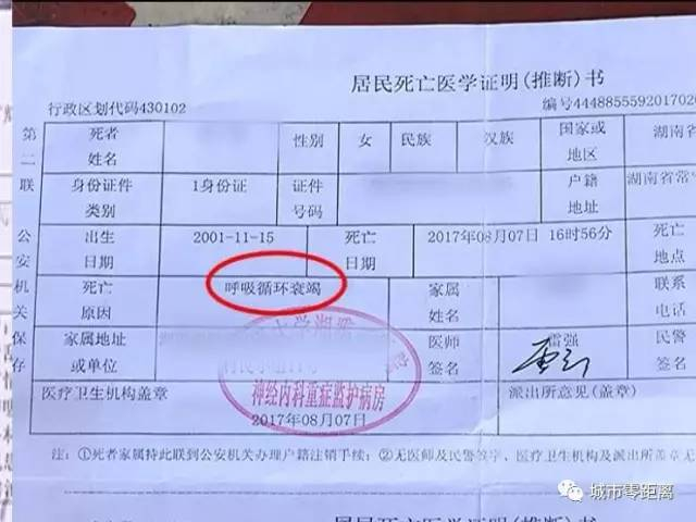 记者看到,湖南当地医院出具的死亡证明书上写明,小飞的死亡原因是呼吸循环衰竭。