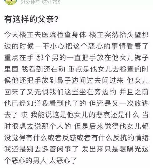 其次,如果曝光者描述的情形查证属实,对于该男子对女儿实施的非礼、猥亵的行为,则另当别论,轻则应受到道德谴责,重则可以课以治安处罚,乃至依法追究刑事责任,非但不能因为父女亲情关系的存在而法外开恩,反而应当依法予以严惩!