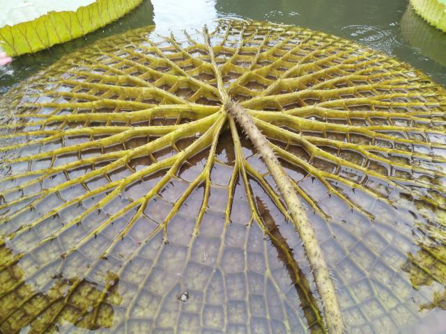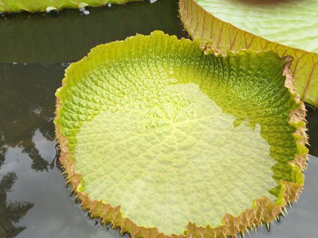 一是王莲的叶子出奇的大。其叶展直径可达3米,像一个巨盆浮在水面上,能轻松承载数十公斤重量,苗条的成人也可在叶片上翩然起舞。