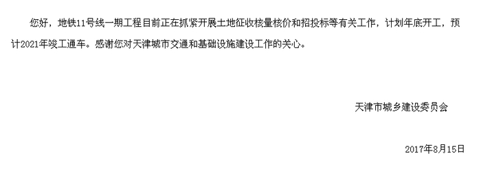 天津市城乡建设委员会回复:地铁11号线一期工程目前正在抓紧开展土地征收核量核价和招投标等有关工作,计划年底开工,预计2021年竣工通车。