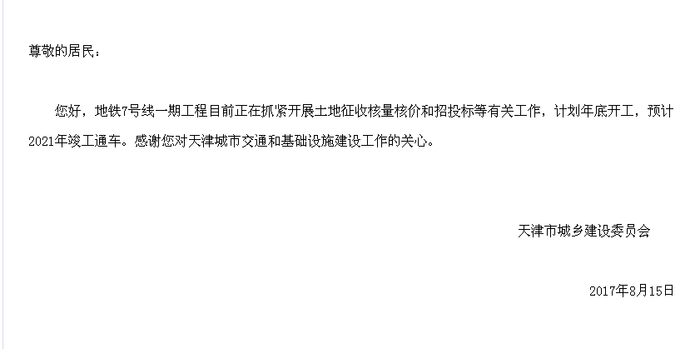 天津市城乡建设委员会回复:地铁7号线一期工程目前正在抓紧开展土地征收核量核价和招投标等有关工作,计划年底开工,预计2021年竣工通车。