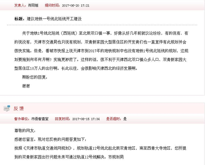 天津市规划局回复:按照《天津市轨道交通线网规划》,规划轨道12号线北起北辰双青地区,南至西青大寺地区,您所提到的双青新家园出行问题未来可通过轨道12号线解决。