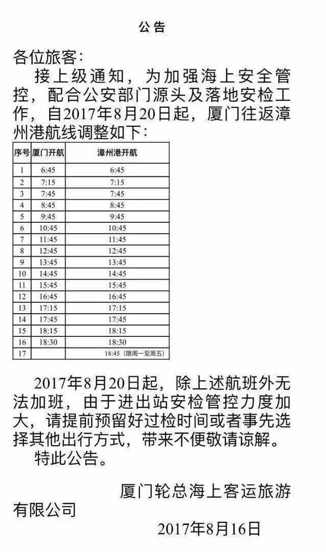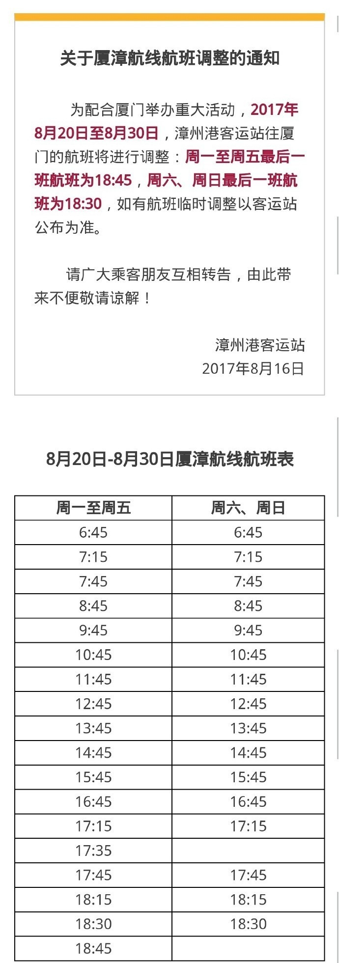 重要提醒!为配合厦门举办重大活动,8月20日至8月30日,漳州港往厦门的航班周一至周五最后一班航班为18:45,周六、周日最后一班航班为18:30,厦门回漳州港的航班每天最后一班均为18:30,如有航班临时调整以客运站公布为准。