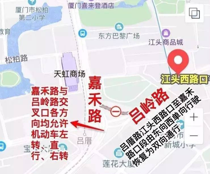 吕厝路江头西路口至嘉禾路口段由东向西(江头西路往嘉禾路方向)恢复双向通行,嘉禾路与吕岭路交叉口各方向均允许机动车左转、直行、右转。