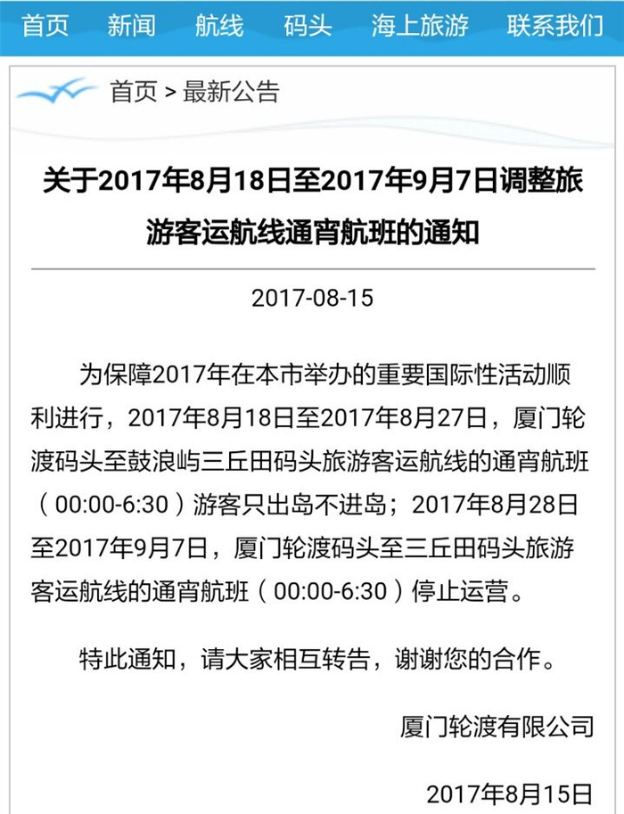 2017年8月18日至2017年8月27日,厦门轮渡码头至鼓浪屿三丘田码头旅游客运航线的通宵航班(00:00-6:30)游客只出岛不进岛;