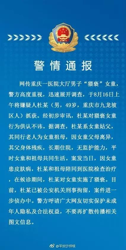 南京南站亵童案件还未尘埃落定,又一起令人瞠目结舌的事件出现。14日,有网友爆料在重庆某医院一男子将手放在未成年女子的裤子内摸其身体。目前,嫌疑人杜某已被抓获,系女童姑父。