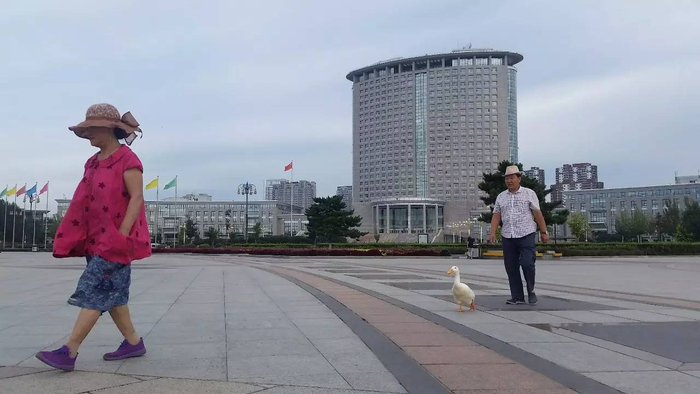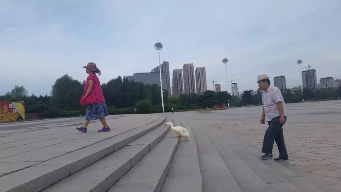 15日,生活报记者就在哈尔滨市政府门前的市民休闲广场上,看到了有趣的一幕:一位大娘和一位大爷一前一后的在广场上走着,一只雪白的鸭子走在他们中间,在广场上“列队遛弯”,让周围的市民忍俊不禁。