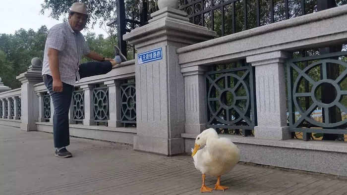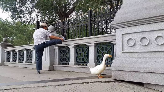 一位大爷正在压腿,一只白色肥鸭子,正在优哉游哉的抖动着屁股。