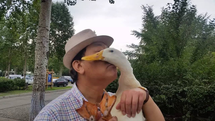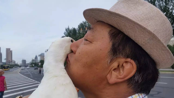 要过马路时,单大爷的老伴喊了一句:“鸭鸭,让姥爷抱。”鸭鸭就停下脚步,单大爷过来抱起鸭鸭说:“鸭鸭,跟姥爷贴个脸。”只见单大爷撅起嘴亲过去,鸭鸭就会主动把头贴在单大爷的脸上,只要单大爷一直贴着脸,它也不会把头移开。