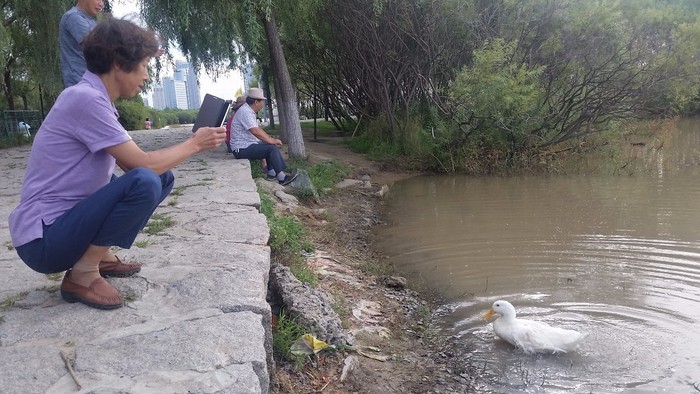 说起为什么养鸭子当宠物,单大爷说:“我外孙子在早市上买了两只小鸭子,一只花的第二天就死了,这只白色的一直养到现在,今年都9岁了。家里就我们老两口,它也给我们做个伴儿了。
