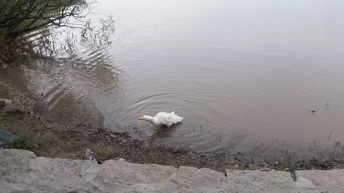 来到一湖三岛,单大爷抱起鸭鸭一把扔到水里。鸭鸭扑着翅膀,稳稳地落在水面上。鸭鸭并不像其它鸭子在水里游泳,不到2分钟的工夫,它就往岸边游了。“再游一会,洗洗脸。”单大爷话音刚落,鸭鸭竟真的把头扎进水里洗了洗。“再洗洗脸”。单大爷连续说了几次,鸭鸭都会照做。
