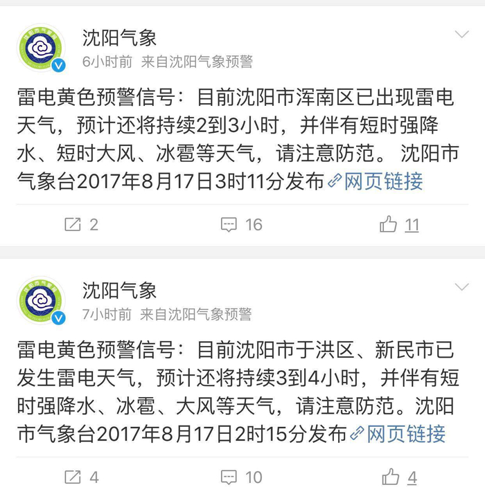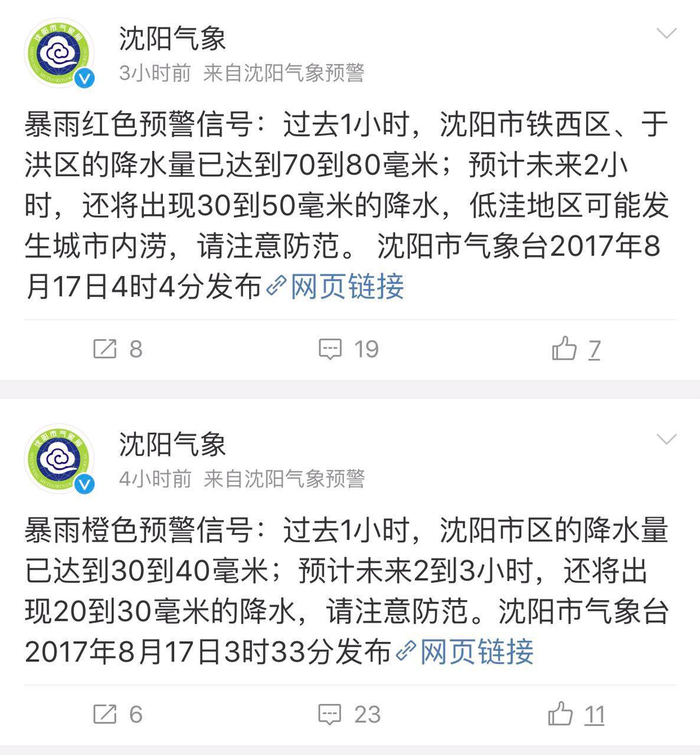 沈阳市气象部门统计,8月17日01时至09时沈阳市出现雷电、短时强降水等强对流天气,全地区7个国家观测站平均降水量24.6毫米,市区最大降水量为114.9毫米出现在沈河区实验小学,全地区最大降水量为141.7毫米出现在苏家屯八一街道,最大降水强度为83.4毫米/小时出现在铁西区的凌空泵站,为历史极值。期间市气象局共发布3个暴雨红色预警信号、4个暴雨橙色预警信号、4个雷电黄色预警信号。沈城市区大雨到暴雨、局部大暴雨,新民、辽中中到大雨,法库小雨,康平无明显降水。