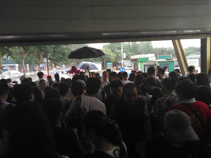 地铁奥体中心站门前已经挤满避雨的行人,这对进出地铁的行人也造成很大阻碍。