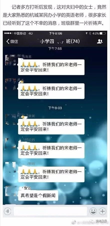 夫妻俩都来自中国杭州,王易南现为圣地亚哥加大(UCSD)博士后研究员,女士是杭州某民办小学的英语老师,很多家长已经听到了这个不幸的消息,班级群里一片祈祷声。