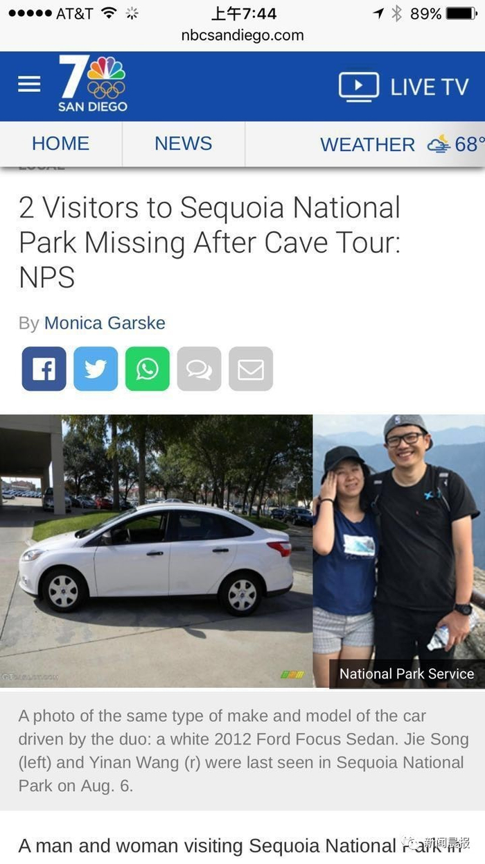 一对中国夫妻王易南(Yinan Wang,音译)和宋洁(Jie Song,音译)在美国自驾游玩,却在红杉国家公园(Sequoia National Park)失联超过一周,在上周五被报失踪。14日,美国警方一路找到国王河(Kings River),并在这里发现了夫妇俩所驾驶的车辆,推测他们已坠崖身亡。