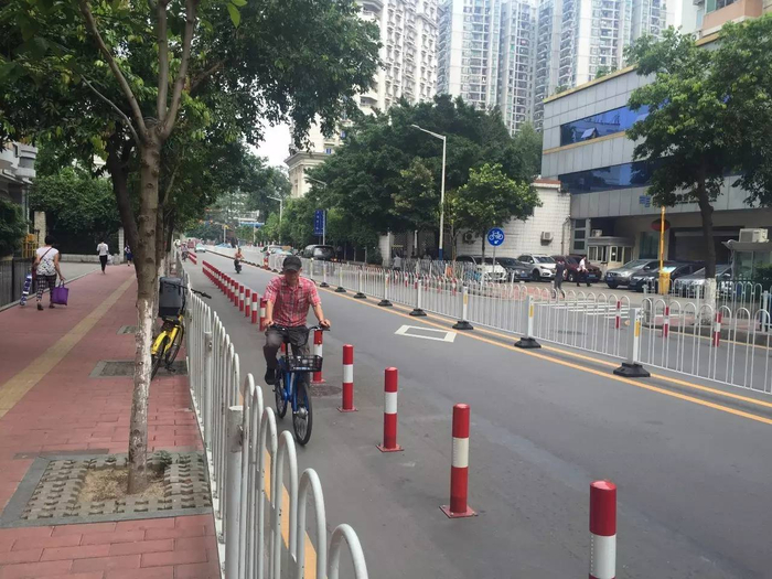 附近小区保安向记者表示:“4月就开始不能停车了,之前收费的咪表位现在都撤掉了。这条路窄,改成自行车道挺好的,骑车方便,汽车少了也没那么吵。”