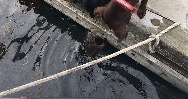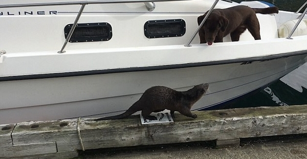 逗趣十足!美好奇水獭与拉布拉多犬水边嬉戏
