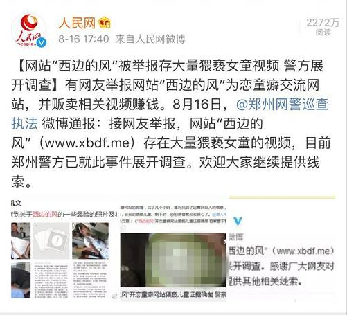 近日,有网友举报,名为“西边的风”的网站为恋童癖交流站,网站内有大量涉嫌猥亵的儿童影像制品。16日,郑州网警发布通报称已接网友举报,目前郑州警方已就此事件展开调查。