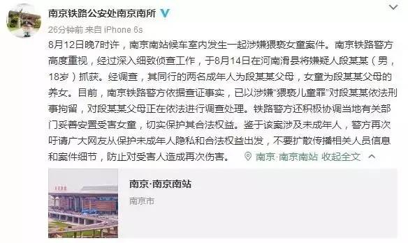 身份确认!南京南站被猥亵女童系家中养女,18岁兄长已被刑拘
