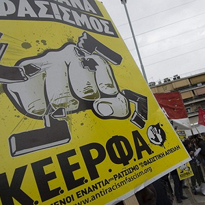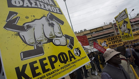 2015年4月20日,希腊雅典,反法西斯示威者手持横幅,高喊口号在对新纳粹党派“金色黎明”进行审讯的科里达洛斯监狱外示威。图片来源:东方IC