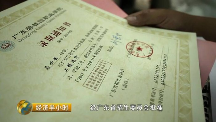 工程造价专业是碧桂园职业学院的王牌专业之一,2017年,在广东省内只招37个人。经过高考和面试两道难关,马世云才得以拿到手上这份沉甸甸的录取通知书。