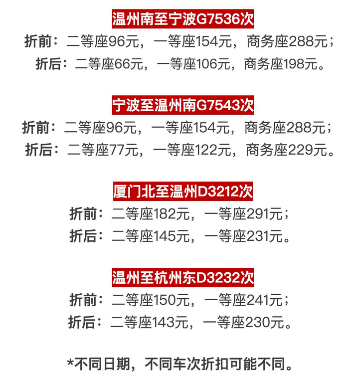 从宁波至温州南的高铁动车,部分车次将有一定的票价折扣。比如从9月1日起,每天8点56分从宁波发车的G7501次,二等座为92元,一等座147元,商务座275元,相当于打了9.5折;每天9点13分发车的G7543次,二等座为77元,一等座122元,商务座229元,相当于打了8折。
