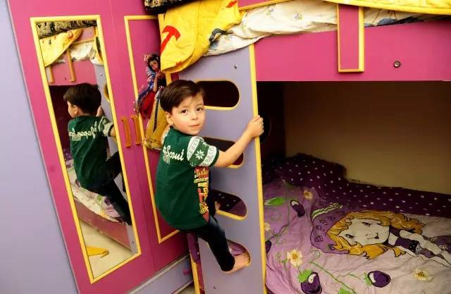 他和哥哥阿布杜拉在一间摆着高低床的卧室里玩耍,地上摆满了五颜六色的玩具。