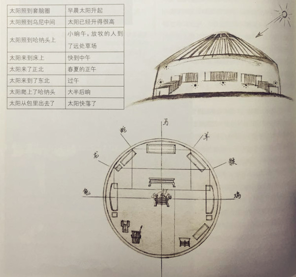 蒙古包既是民居,又是时间计量的工具。这得益于蒙古包顶的套脑和呈圆形辐射状的乌尼杆,能够均衡地丈量太阳照在蒙古包里的时间,是蒙古包变成一个日晷。