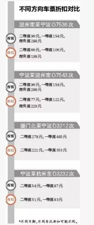 从宁波至温州南的高铁动车,部分车次将有一定的票价折扣。比如从9月1日起,每天8点56分从宁波发车的G7501次,二等座为92元,一等座147元,商务座275元,相当于打了9.5折;每天9点13分发车的G7543次,二等座为77元,一等座122元,商务座229元,相当于打了8折。