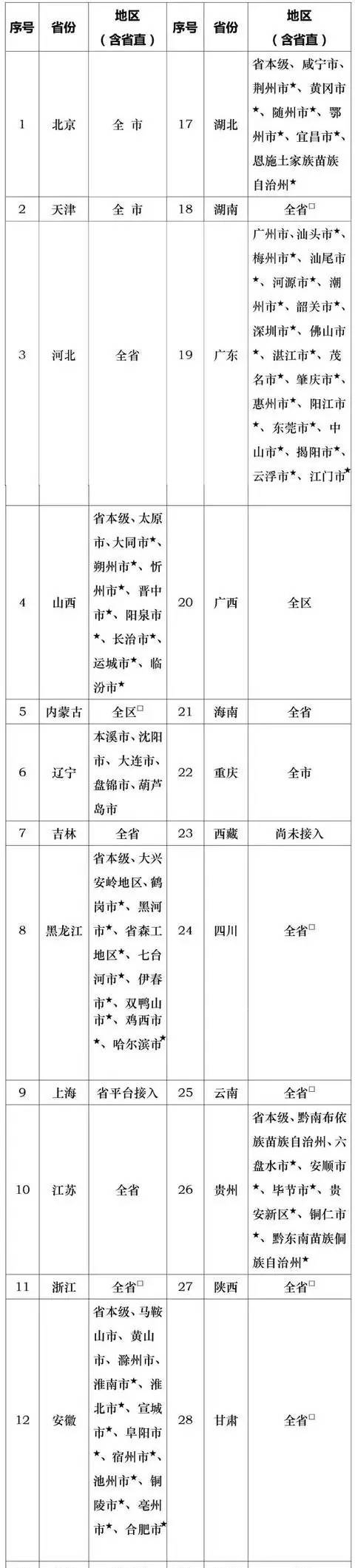 2. 带□的已开通省份,指第二期发布与首期发布的新增全省接入省份。