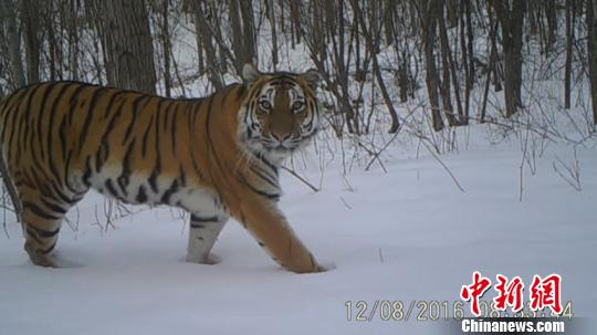 中新网长春8月17日电 (郭佳 魏静)白雪皑皑的山林中,一只体型健壮的东北虎走到远红外相机前停了下来,目光深沉,表情平静,花纹清晰,虎须根根可见。吉林省林业部门架设在野外的远红外相机拍摄下来的珍贵影像,显示出一度“背井离乡”的野生虎豹正重返东北故土。