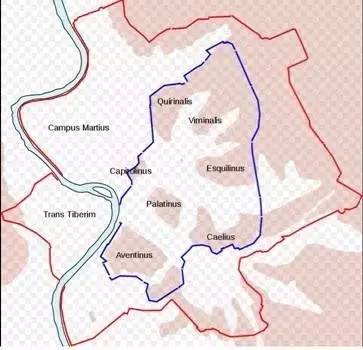 下图红线内是就是Aurelian城墙内的古罗马城,图中那根蓝线是在六七百年前的公元前4世纪开始建的古罗马Servian城墙,面积更小。