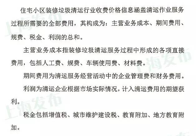 上海市市容环境卫生行业协会等公布《上海住宅小区装修垃圾清运行业收费价格信息》,明确了住宅小区装修垃圾清运行业收费价格信息的定义,明确收费价格主要成本构成、计价方式、标准以及收费主体。住宅小区装修垃圾清运,根据首次和非首次装饰装修、基本面积等标准计价,此外,机关、企事业单位装饰装修垃圾清运处置费将根据清运、分拣等环节,按市场化、全成本要素,协商收取。