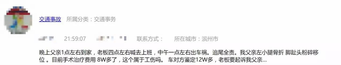父亲凌晨1点左右回到家,老板凌晨4点左右要求父亲去上班,父亲中午1点左右出车祸,追尾全责。我父亲左小腿骨折,脚趾头粉碎移位,目前手术治疗费用8万多,这个属于工伤吗?对方鉴定车损要12万多,老板却要起诉我父亲,合理吗?