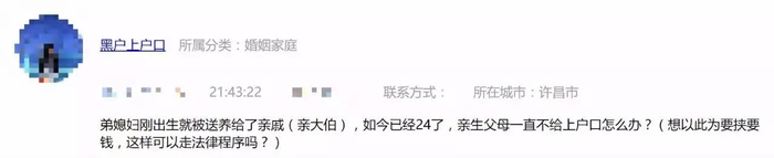 弟媳妇刚出生就被送养给她亲大伯,如今已经24岁了,但亲生父母一直不给上户口怎么办?他们想以此为要挟来要钱,这样可以走法律程序吗?