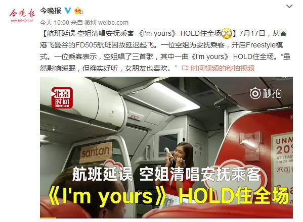 【航班延误 空姐清唱安抚乘客 《I'm yours》 HOLD住全场】7月17日,从香港飞曼谷的FD505航班因故延迟起飞。一位空姐为安抚乘客,开启Freestyle模式。一位乘客表示,空姐唱了三首歌,其中一曲《I'm yours》 HOLD住全场。“虽然影响睡眠,但确实好听,女朋友也喜欢。”