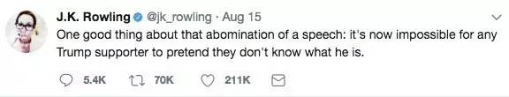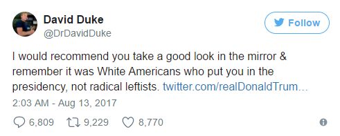 而特朗普此前谴责暴力的推特还遭到前3K党领袖大卫·杜克的“羞辱”: