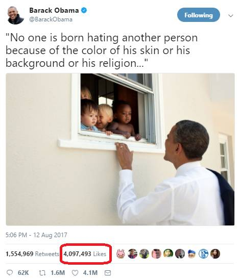 这条推特是奥巴马对于美国弗吉利亚夏洛茨维尔事件的回应,引述了前南非总统曼德拉在自传《漫漫自由路》(Long Walk to Freedom)中的名言: