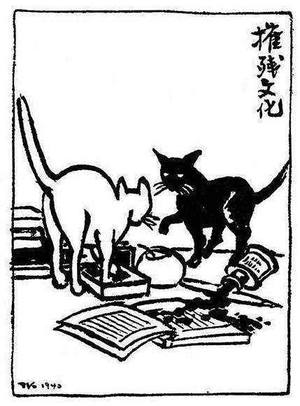 宋雪君:丰子恺有四篇文章写猫,大概有42幅画以猫为主题,曾经有个出版社出版了一本书就叫《阿咪》。他在1942年画过一幅画叫《摧残文化》,一只白猫一只黑猫在丰子恺桌上,把墨水打翻,纸张弄破,看到这幅画就觉得很可爱。丰子恺的照片里有猫的也很多,猫可以坐在他的脚上,坐在他的肩上,甚至可以爬到他的头上。他一点也不在乎,他看书,猫也在头顶看书。这只猫眼睛就盯着书看,他不在乎猫,猫也不在乎自己坐的位置,大家都习惯了。