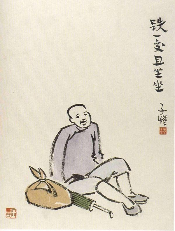 杨朝婴:还有一幅画是《跌一跤且坐坐》,一样跌跤了,你不要怨这个怨那个,怨地皮不好,腿脚不好,他就坐下来,笑嘻嘻的。这是一种很好的心态。