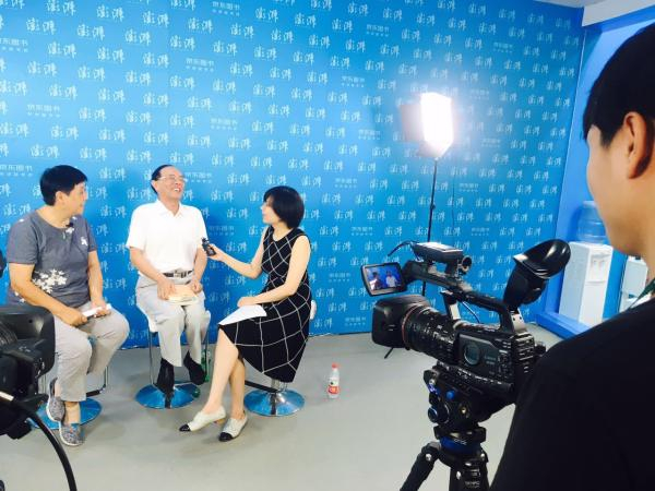 丰子恺外孙宋雪君(左二)、外孙女杨朝婴(左一)在书展澎湃直播间接受“澎湃新闻·艺术评论”采访,当时宋雪君正在模仿外公的样子