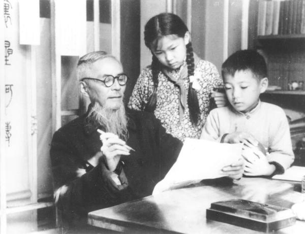 1962年外孙女杨朝婴、外孙杨子耘在日月楼看外公作画